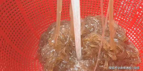 第三步:鍋中燒開水,把泡軟的紅薯粉條放進去燙至透明,完全透明後,就可以把它夾起來瞭,然後放到冷水中盤中,用筷子攪一下,把它打散,再倒到籃子中,用清水再沖一下,稍微晾幹水分備用。