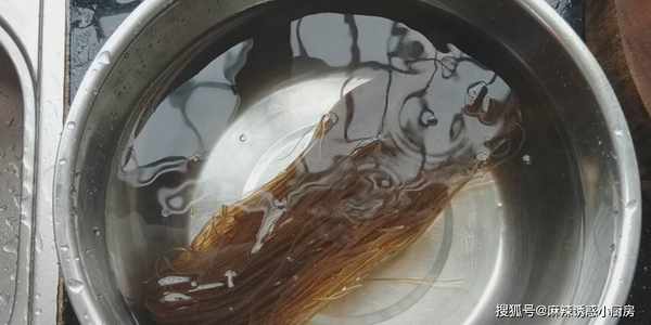 第一步:準備一把紅薯粉條,提前用水泡軟,紅薯粉有很多種的,我喜歡吃這種純紅薯粉條,顏色稍深一點,但吃起來口感特別好。