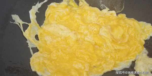 第五步:鍋中下油,油熱後倒入雞蛋液滑熟,然後弄碎,再盛出備用。