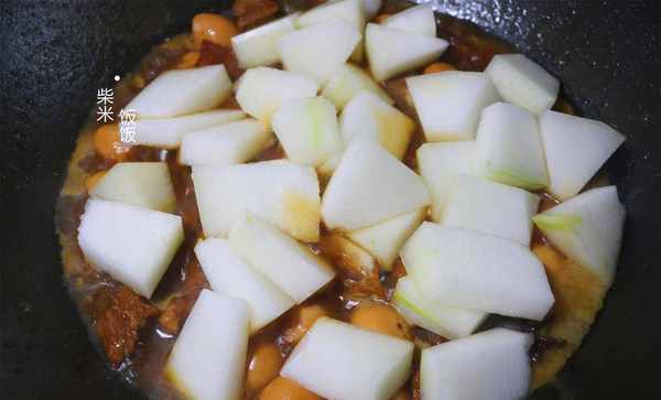 6,牛肉燉熟,把冬瓜倒進來,如果水少瞭,可以加一些開水進來。再燉15分鐘左右,把冬瓜燉熟。