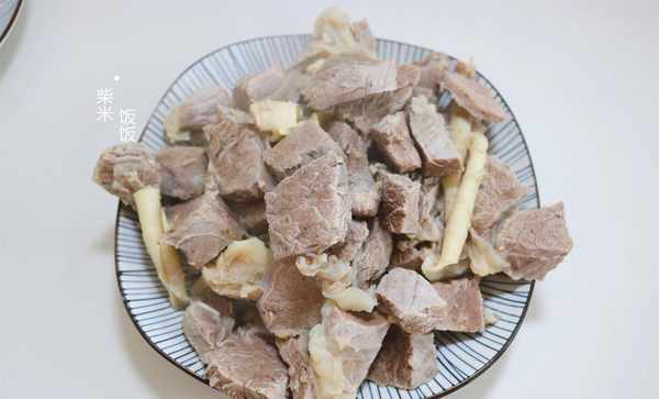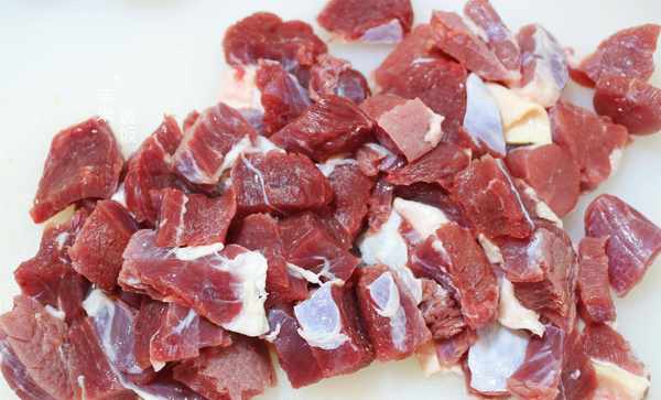 1,牛肉洗凈,逆著牛肉的紋路切成小塊。