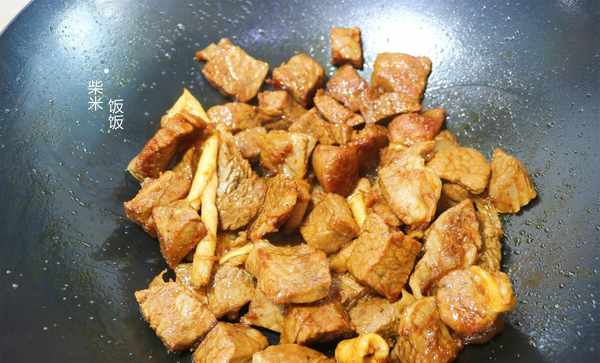 4,將牛肉倒入鍋中,快速翻炒均勻,使糖色裹滿牛肉的表面。