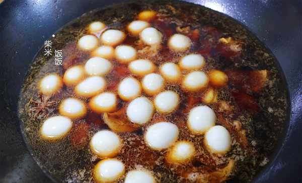 5,接著加入足量的開水,放入一個八角、幾個薑片、大半勺老抽、1勺生抽、少許鹽入底味。再把鵪鶉蛋倒進來。大火煮開,蓋上鍋蓋小火燉一個半小時。