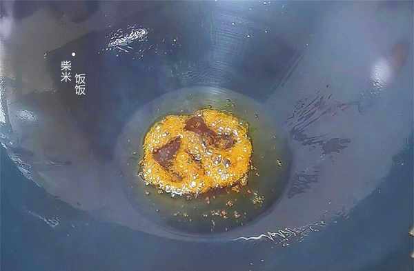 3,鍋裡加入適量油,放入一小把冰糖,中火將冰糖炒化。再轉小火將冰糖炒成紅褐色,表面冒泡的狀態。