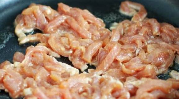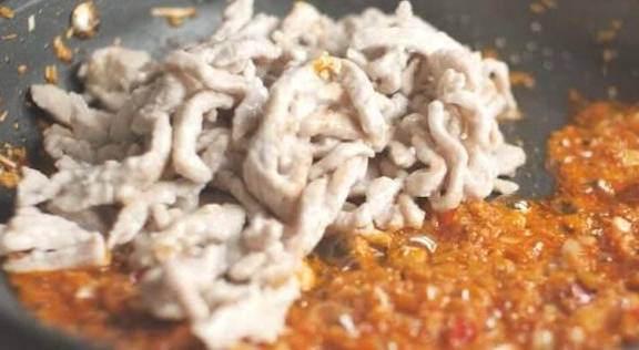 鍋裡放油,油溫6成熟的時候下入醃制好的肉絲,這一步註意瞭,不要放油就放肉絲,也不要油燒滾後再放肉絲,這樣容易粘鍋導致肉絲不好吃,肉絲倒進鍋裡後炒至變色後就可以撈出來瞭,接下來就可以炒調料瞭。