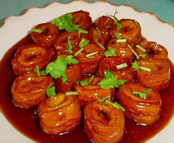 山東九轉大腸被譽為是山東濟南的經典名菜之一。出鍋以後的九轉大腸不僅僅像成熟的水果那樣色澤豐滿紅潤,也像彈簧一樣富有彈性,外形形狀還像千層餅一樣,層次分明,一層接著一層。讓人吃起來的口感既覺得嫩嫩的,還不會讓人感覺到油膩惡心。味道絕美,香氣飄香,就是經常吃,也會覺得吃不夠。