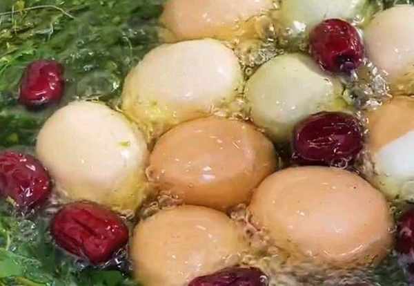 2,洗好的薺菜放在鍋裡,圍在鍋邊,像搭鳥巢一樣。然後把雞蛋放進去,再加幾顆紅棗,加入適量的水大火煮十分鐘左右。