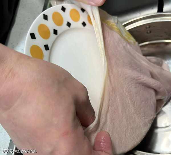 要把豬肚焯一下水,豬肚遇熱後會縮小,可以找一個盤子,塞到豬肚裡,撐起來再焯水,就好多瞭