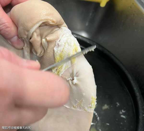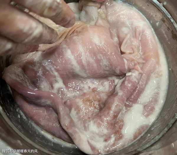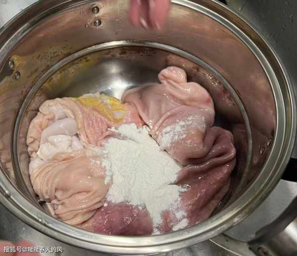 倒入面粉或淀粉,把豬肚裡裡外外都搓一下
