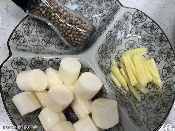 準備白胡椒,最好是顆粒的,拍一下,讓胡椒的香味兒散發出來,生薑和鐵棍山藥,黃酒小半碗,紅棗,枸杞