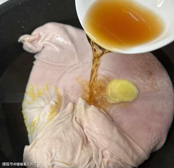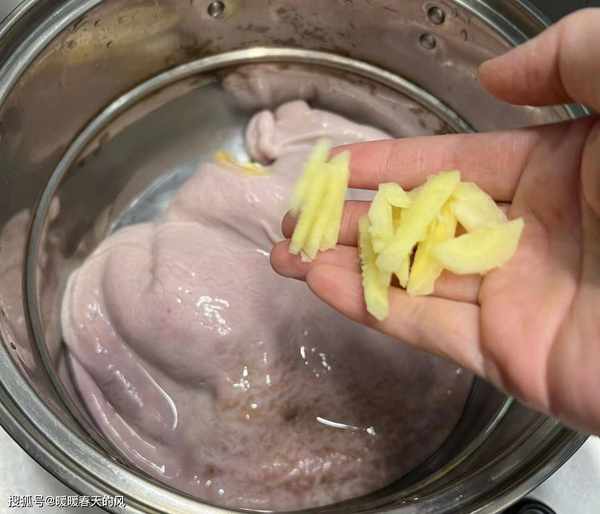 鍋中放涼水,把肚放進去,倒入黃酒和生薑,煮