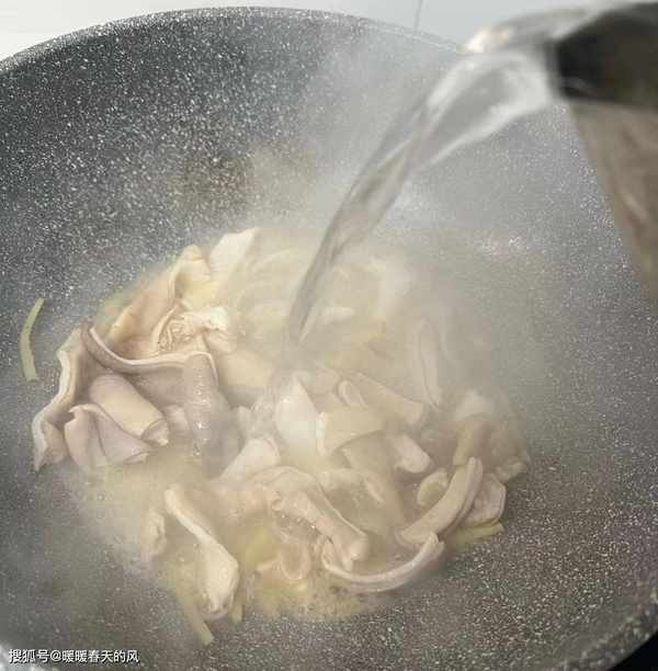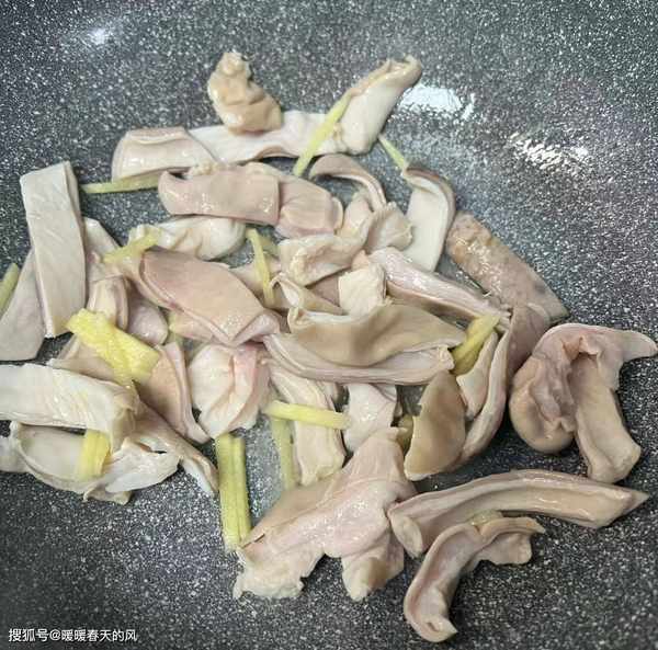 起鍋燒油,少量油即可,倒入豬肚和生薑煸炒一下