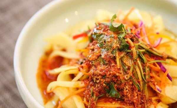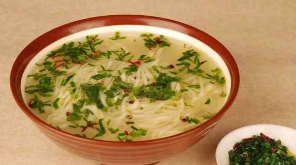 漿水面是以漿水做湯汁的一種面條。可能沒吃過的會問瞭,什麼是漿水面?首先漿水面先要制作漿水。就是把芹菜、箭桿白菜、蓮花菜煮熟投入面湯,加上漿水酵子,盛入缸內,放在溫暖處發酵三天,即可制成清酸可口的漿水。再將將手工搟制的長面煮熟,涼開水浸過,盛入碗內,澆上熗過油蔥花、花椒水、調入辣椒油、撒上芫荽末,即成漿水面。