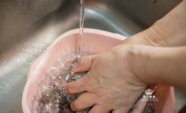 3、浸泡好的花蛤放到水龍頭下面反復清洗幾遍,確保泥沙最大程度地沖走,吃起來也不會硌牙。