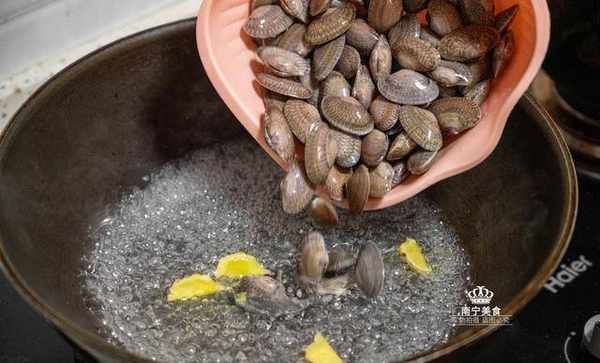 4、架鍋燒水,放入幾片生薑,水燒開後將花蛤倒入鍋內,蓋上蓋子,加快花蛤的開殼速度。