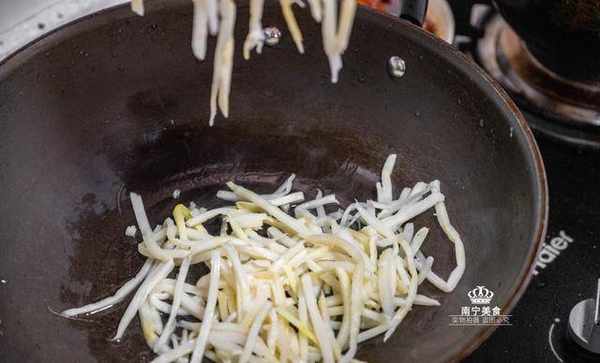 8、炒到酸筍有明顯縮水的跡象,表面也泛黃瞭,就可以淋入少許的食用油,繼續煎炒酸筍激發油香味。