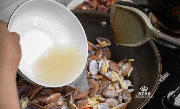 10、倒入少量前面煮花蛤的湯水,增加鮮味,也以防酸筍太幹糊鍋。