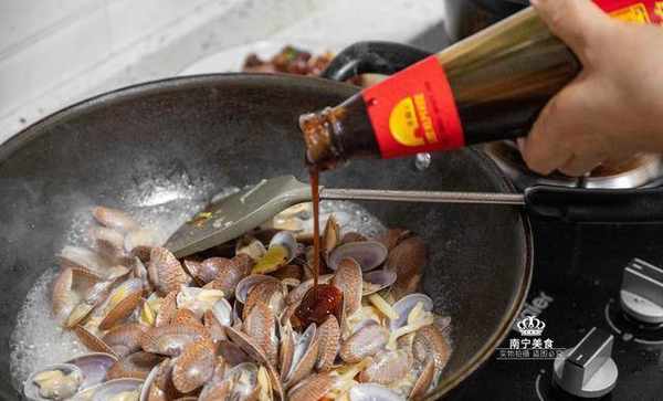 11、花蛤已經煮過一遍其實已經熟瞭,所以不需要再煮太久,放入少許蠔油、老抽豐富口味。