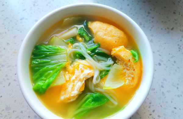 食材:小白菜、粉絲、雞蛋、豆泡、年糕、鹽、雞粉