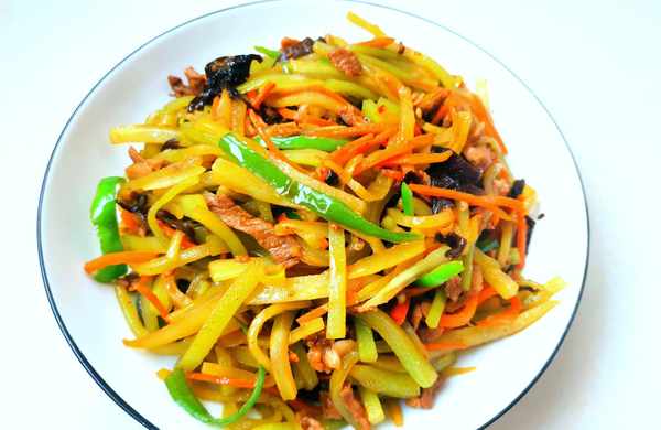 1、萵筍去皮後切成細點的條,胡蘿卜和青椒處理幹凈後切絲,木耳泡發後切絲,五花肉切絲