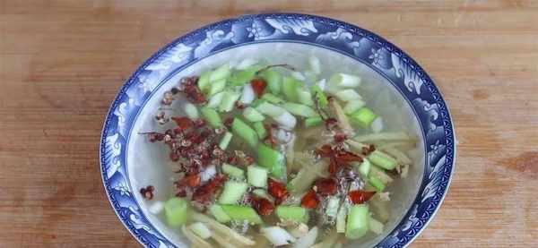 2.現在來制作一點蔥薑水,碗中加入切好的蔥薑,再加一小把花椒粒、兩顆掰碎的八角,然後倒入熱水浸泡一會。