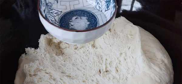 12.現在面已經發酵好瞭,扒開裡面都是蜂窩狀,加入一碗底的蘇打水揉均勻(一斤面放2g小蘇打就行)。