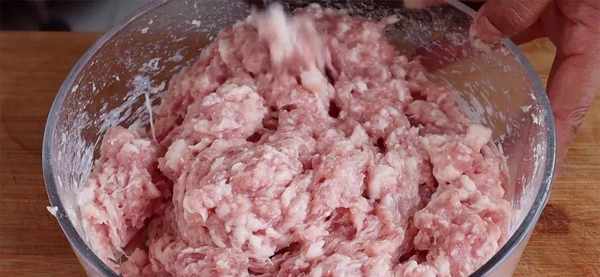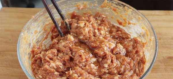 10.調料攪勻後,往肉餡裡加入一大勺剛剛炸的料油,再次攪勻。