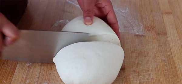 13.面板上撒一點幹面粉,把面團放案板上繼續揉均勻、揉光滑,然後切成2等份,這樣更好操作。