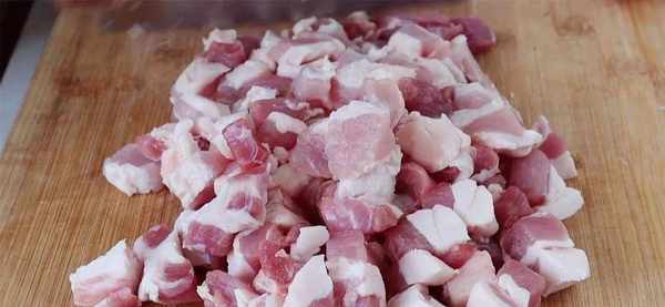 3.現在來準備肉餡,五花肉洗凈,把肉皮去掉,把肉切成小塊,然後放入絞肉機裡,小籠包的肉餡絞細膩一點更好吃。