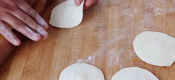 15.把小面劑搟成中間厚邊緣薄的面皮。