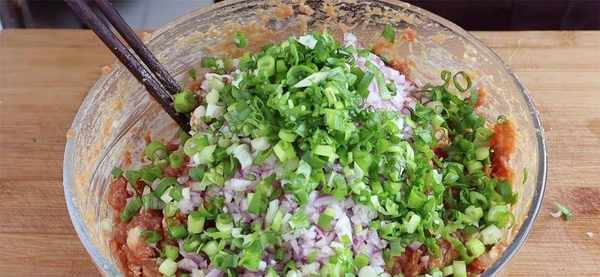 11.最後往肉餡裡加洋蔥末和蔥花,充分攪勻,這樣肉餡就調好瞭。(洋蔥和蔥花都有去膩增香的作用,可以讓小籠包好吃不膩。)