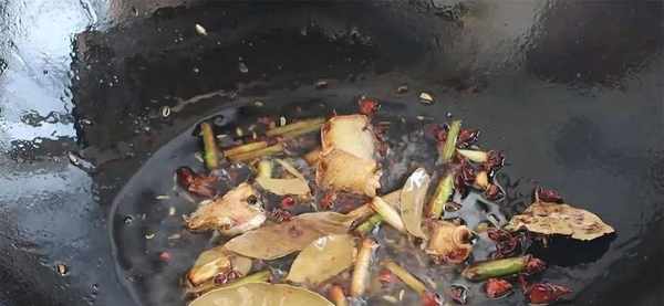7.鍋中加適量食用油,油微熱後加入花椒、八角、香葉、桂皮,小茴香、蔥段、薑片,用小火慢慢炸出香料裡的香味,香料被炸到顏色幹黃後撈出來丟掉,把剩下的油倒入碗中備用。
