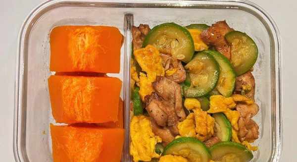 西葫蘆雞肉片炒雞蛋+蒸南瓜