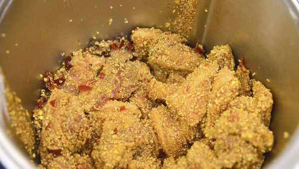 4.加入打碎的米粉,以1分鐘/反轉/速度2混合,讓米粉包裹每片五花肉;