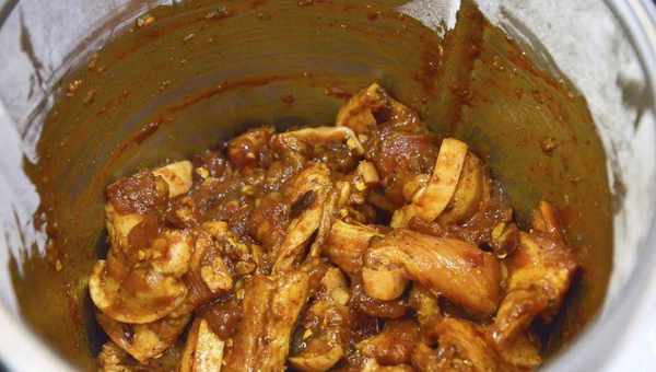 3.將八角、幹紅辣椒段、花椒粉、料酒、紅油腐乳、甜面醬、老抽、生抽、白砂糖、豆瓣醬、食用油、五花肉加入小美鍋中,以1分鐘/反轉/速度2混合均勻,然後留在鍋中醃制10分鐘;