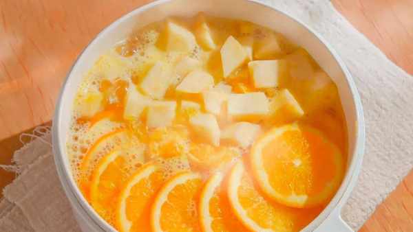 2、剩下一個橙子,取出果肉撕開放入鍋中,加入少量清水和兩勺冰糖,大火煮開後,擠入檸檬汁,放入橙片、檸檬片和蘋果,加水再煮3分鐘,一道瘦身刮油湯就可以喝瞭。