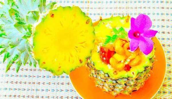 1、菠蘿葉子下一點點切開,將裡面的菠蘿肉挖出,用鹽水浸泡後備用;