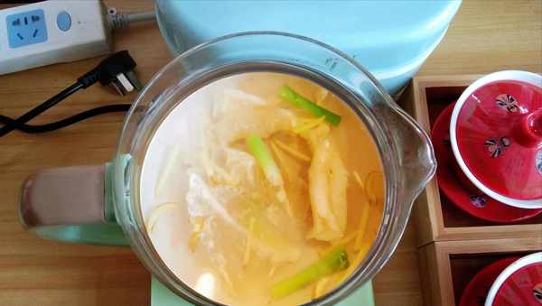 1. 取幹花膠15-20克,生薑小蔥切段、一起煮5分鐘去腥,然後泡發花膠,中間換3次水