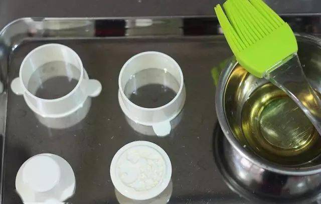 將綠豆糕模型,用刷子塗抹適量食用油(份量外)備用。