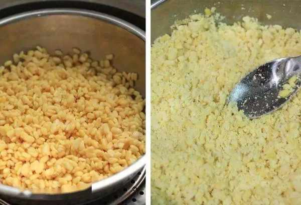 將綠豆仁放入電鍋中,外鍋放半杯量米杯水量,蒸好後(約10分鐘)取出,趁熱用湯匙壓成泥。