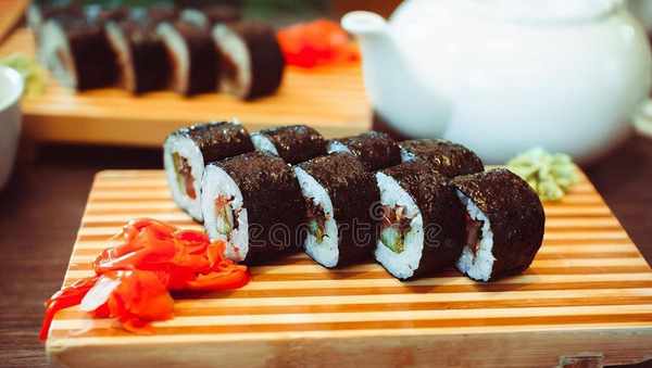 第四步:得到一個圓條型的壽司,用刀切成小段即可