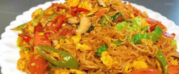 接著起鍋倒油,油熱之後把雞蛋液倒入鍋中,用鏟子將它快速地打圈劃散,這樣做出來的雞蛋又嫩又好吃。炒好之後把雞蛋盛出來,放在一旁備用。另起鍋倒油,將大蒜放進去,爆出香味,再將西紅柿放進來,稍微翻炒之後,將香菇一塊放進來翻炒。將西紅柿翻炒至稍微變軟之後,把青紅椒和火腿腸一起倒進來,充分翻炒均勻之後,就可以把蒸過的方便面倒進來瞭。快速地翻炒均勻,動作一定要快,姿勢一定要帥,千萬不能讓方便面粘鍋糊底瞭。最後再把靈魂雞蛋倒進來,一起進行翻炒。