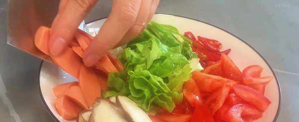 接著我們來準備一些配菜,一顆大蒜拍一拍,把外皮剝掉,然後切成蒜片;再根據個人口味,準備一些青椒和紅辣椒,將它們斜切成片即可;再準備一個西紅柿,對半切開之後,將它的硬蒂部分切除,因為這個部分口感不太好,然後再將它切成小塊;再拿來一個飽滿的香菇,將它切成薄片即可;再準備一小把生菜,切成小段,大傢可以根據個人喜好來準備青菜,隻要能夠給我們補充維生素就行;再來一根火腿腸,將它切成薄片,不喜歡吃火腿腸的朋友,把它換成豬肉、牛肉、羊肉都可以;接著再準備一個小碗,碗中打入2顆母雞蛋,用攪蛋器(筷子)將它們充分地打散即可。大傢記得一定要葷素搭配哦,這樣膳食才更平衡。所有的配菜都準備好之後,把它們放到一個盤子中備用即可(雞蛋液另外放)。