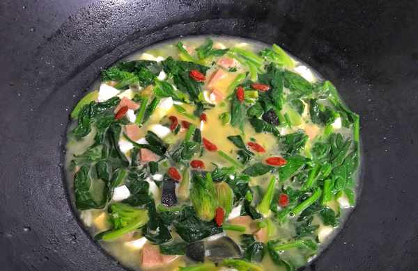 9、煮開後先把菠菜梗先放入,再把菠菜葉一起放入煮開即可關火。