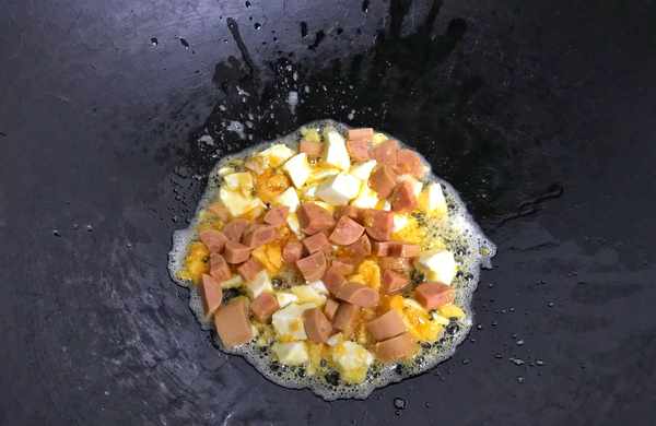 6、咸鴨蛋煸至出油脂後把火腿腸放入鍋中。
