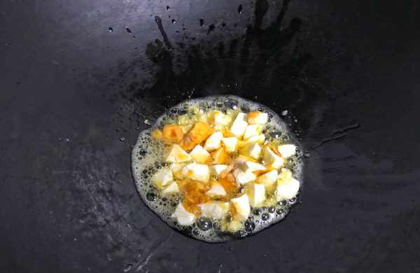 5、鍋中倒入適量油,放入大蒜煸炒出香味後把咸鴨蛋塊放入鍋中。
