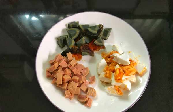 3、皮蛋去殼切成小塊,咸鴨蛋去殼切成小塊,火腿腸切成小丁。