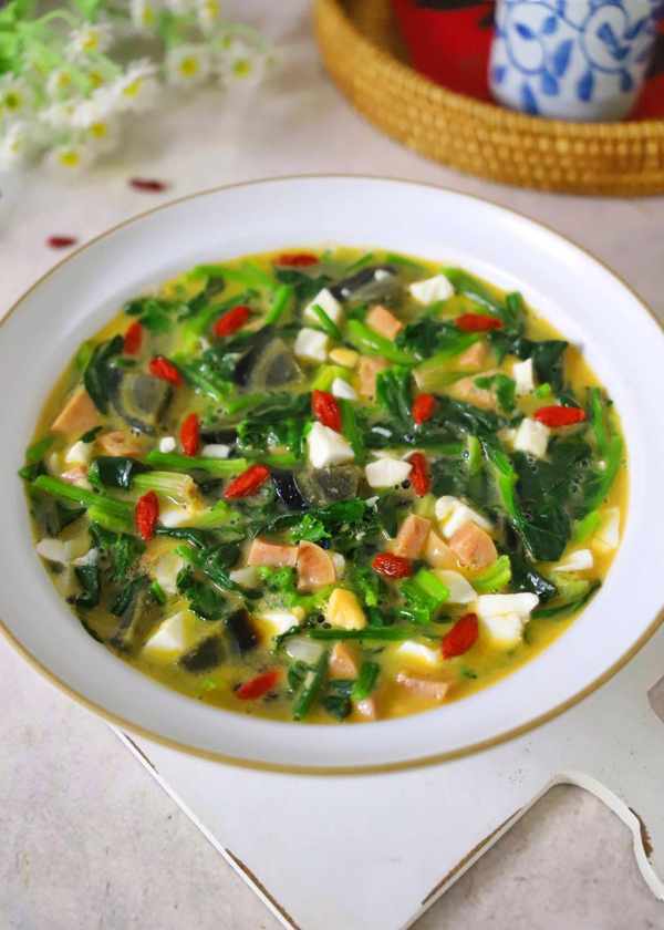 菠菜吃法多樣,涼拌,熱炒,做湯都好吃,今天的湯就是用菠菜來做瞭,配料用的是上湯三劍客,皮蛋,咸鴨蛋和火腿腸,不需要用高湯,截然不同的三種滋味,煮出瞭自成一派的“上湯”,做法很簡單,價格也不貴,具體做法分享給大傢!