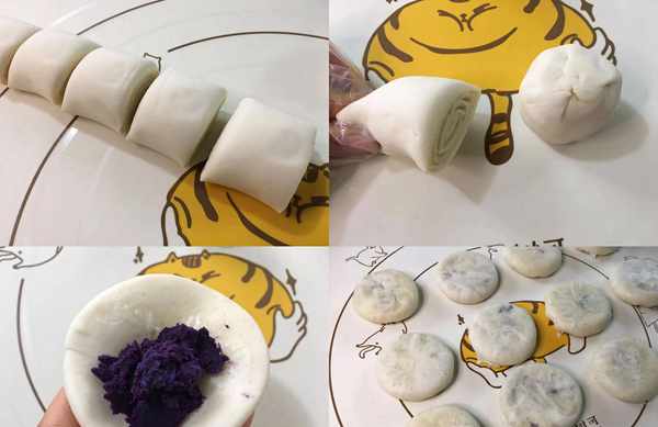 ⑤卷好好切成相同等份的面劑,依次把面劑的切口處捏緊,再搟成面皮,放入紫薯餡,像包包子一樣包起來,收口朝下再搟成小圓餅。
