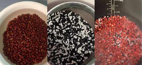 ①紅豆洗凈後浸泡5個小時,黑米和糯米洗凈後撈出備用。